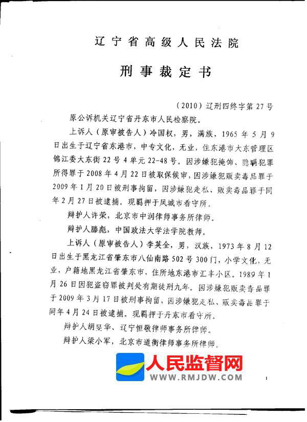丹东市检察院违法办案将该案诉至丹东市中级法院,法院一审判处冷国权、李英全二人死刑,冷国权、李英全当庭提出上诉。