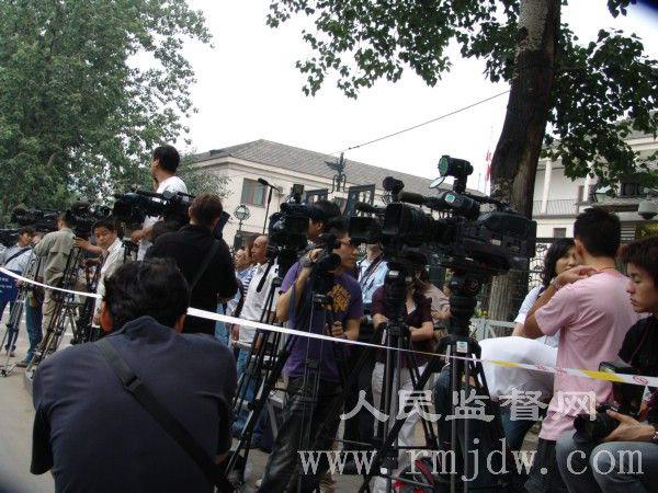 下午1点多钟,各国记者早早的来到日本国驻华使馆前。至2点十分,聚集在日本国驻华使馆前的各国记者达上百名,为保证使馆区的秩序,北京警方将前来采访的新闻记者们的证件验证登记,并划定了新闻记者采访区。