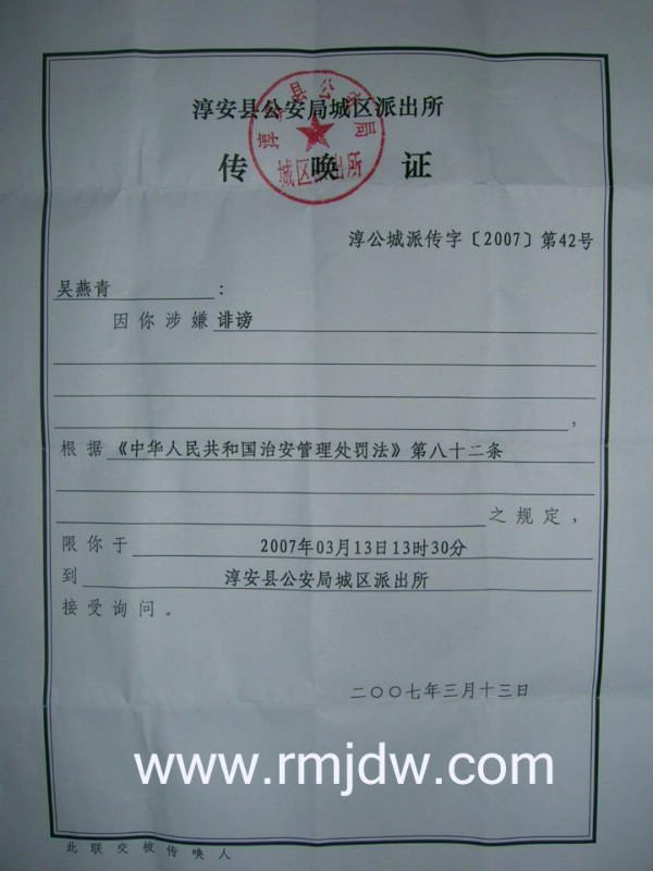 吴燕青对记者说,2007年3月6日下午,我到公、检、法、县委、县府、政法委等部门去发网站刊登的“浙江淳安法院暴力执法无辜店主致残文章”。当到县政法委去时,政法委副书记(2003年时淳安县法院分管执行的常务副院长)汪孝群问我们发了多少,发到什么地方,我说都发了,发了好几百张,我问他发这个犯不犯法的,他说发这个是违法的,扰乱治安的。又质问我记者叫什么名字,什么电话号码,记者是怎么知道的,我说是上网知道的,名字和电话号码那上面有的。我说发这个东西目的是让领导知道,你说我发这个东西犯法,那姚春妹把我打成骨折都没有人去抓她,为什么?后来,汪孝群说叫我们走正规渠道,我说我们到处告状上访五年了,到现在都没人理睬我们。