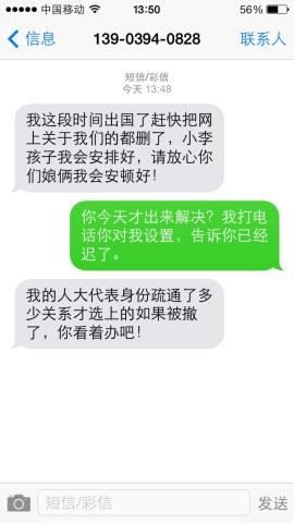 罗志元发给李姗姗的短信内容称:“人大代表是靠疏通关系得来的”。