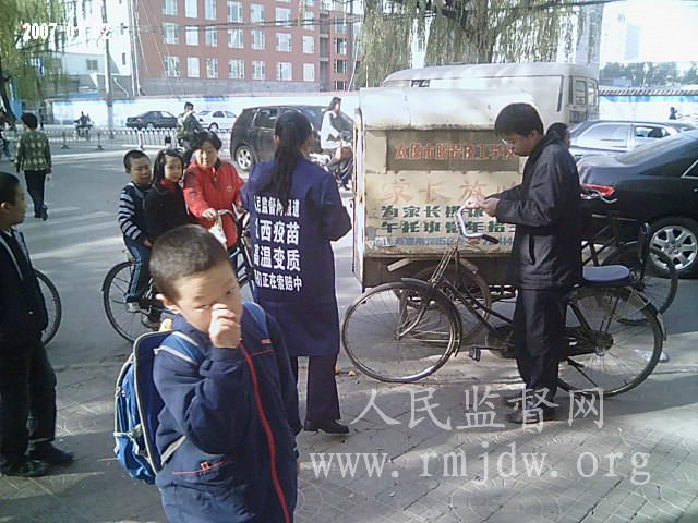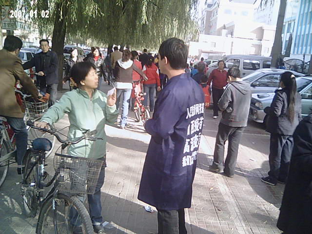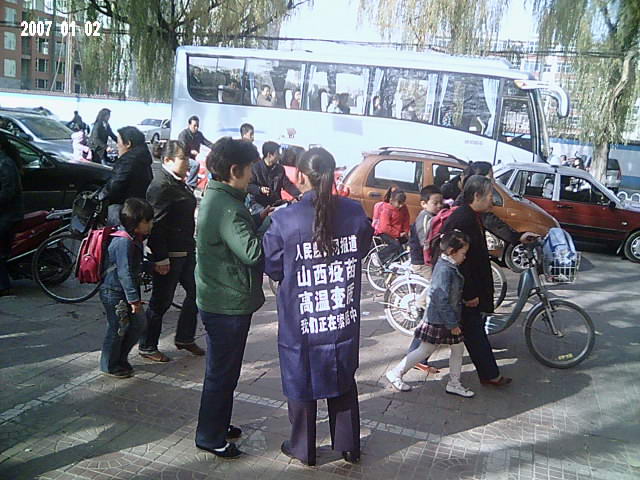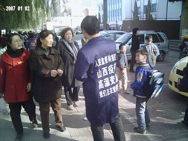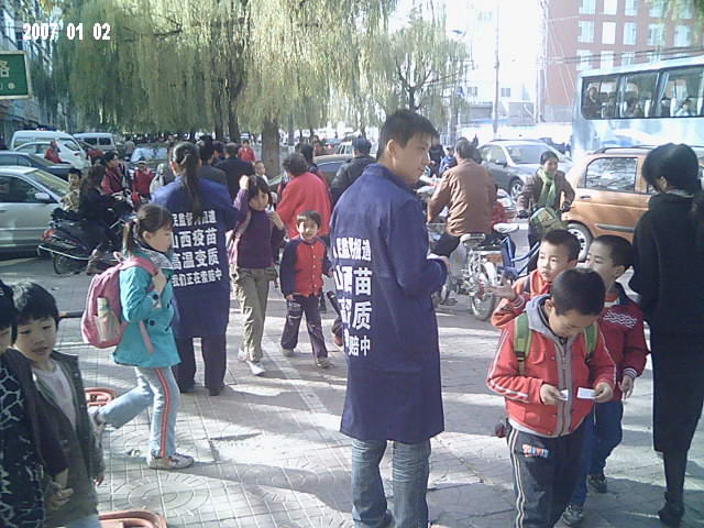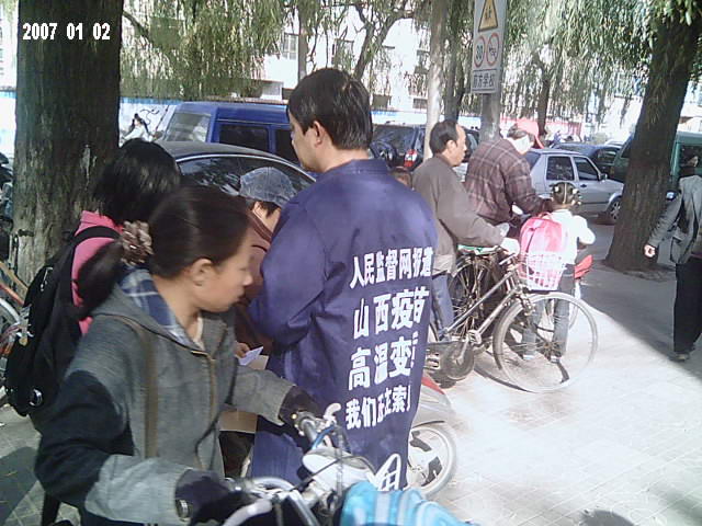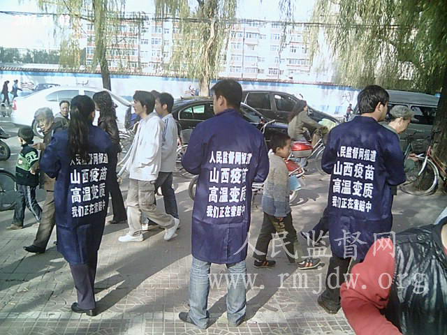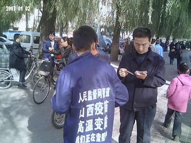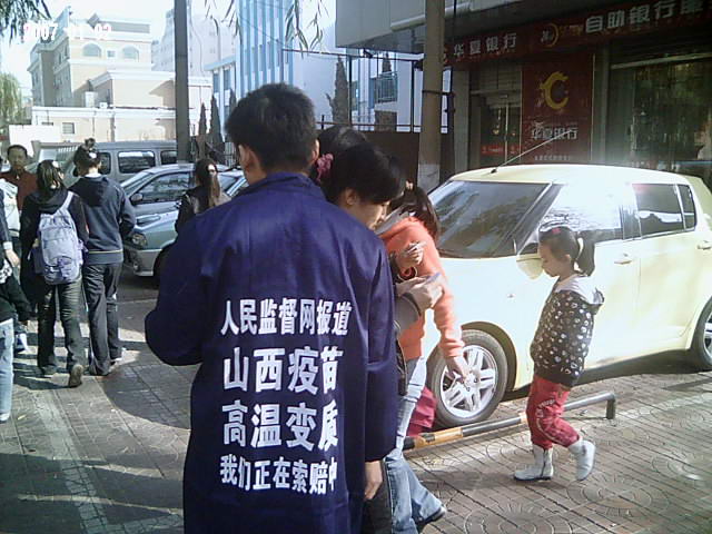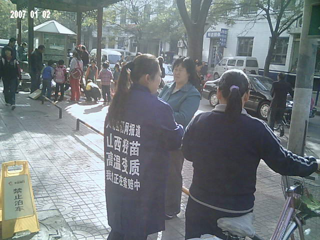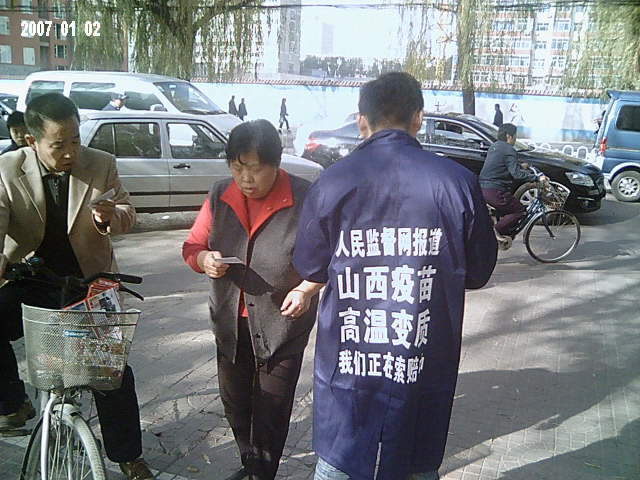本图:中国公民志愿者上街发放山西高温变质疫苗告知卡