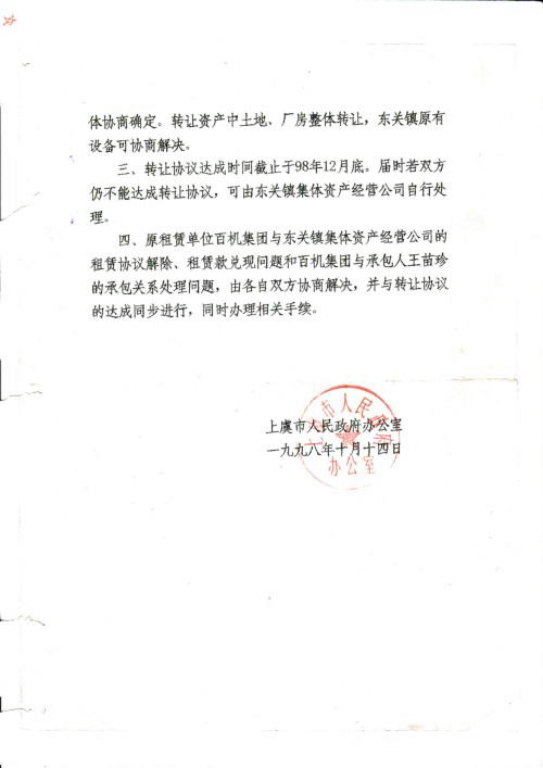 在王苗珍的强烈抗议下,19981014日,上虞市政府组织镇政府、群众代表、百机集团承包人等召开了协调会议,确认王苗珍与百机集团原协议解除,将企业以300万元转资给王苗珍经营,同年签订了资产转让意向书。