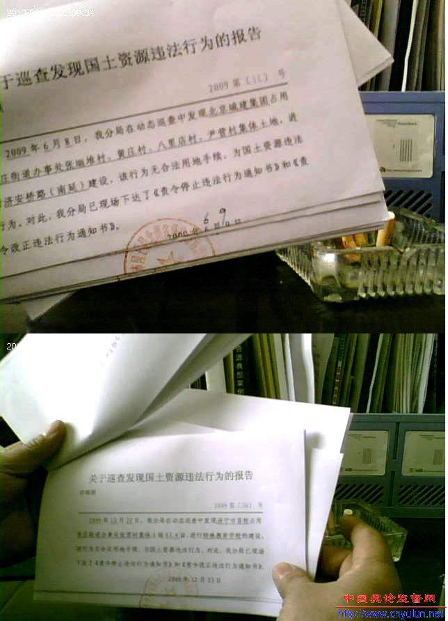 投诉人向记者提供了北湖度假区国土资源局《关于巡查发现国土资源违法行为的报告》,这些多达十多份的报告称黄庄村、八里店等“征用”土地无合法手续,并“以下达了责令停止违法行为的通知”,但北湖度假区对此置若罔闻,继续他们的违法征地行为。北湖度假区国土资源局同时证明,投诉人举报北湖度假区基本农田一万多亩全部属实。