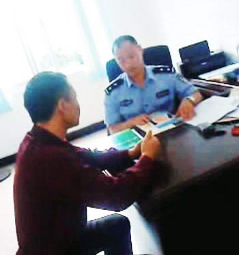 成和平(穿警服者)和吴先生就赎车款讨价还价。