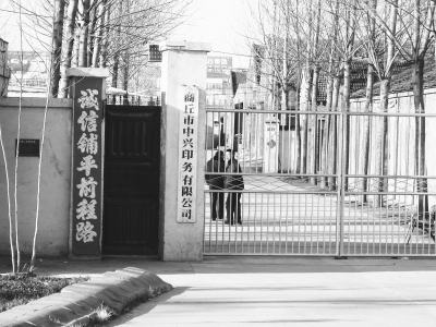 3月3日下午,商丘市中兴印务有限公司门口一侧的对联“诚信铺平前程路”清晰可见。画面中的两人在记者拍摄照片后,以记者“偷拍”为由报警,并拦住记者搭乘的车不让离开。 本报记者  来  扬摄