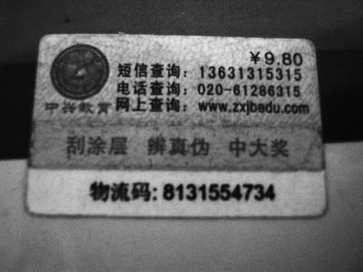 记者看到,该图书的封面上都贴附着一张有防伪涂层的贴膜。该贴膜分为上中下3部分,上方黄色底色部分印有中兴教育的图表和4排数字,最上面一排是一个4位数字,一般是2280、1980或1580,接下去的3排数字分别是防伪查询的联系方式;中部是印有防伪号码的涂层,而最下方则是一个由10位数字组成的“物流码”。