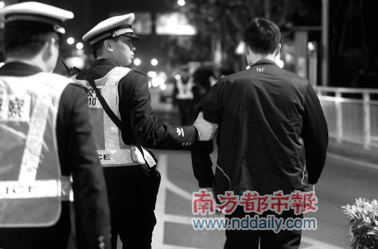 2月2日晚上,一名涉嫌醉驾的男子被交警搀扶着去接受酒精进一步检查。南都记者 徐文阁 摄