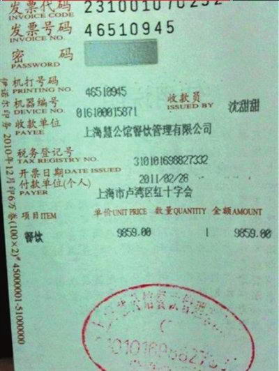这条图文并茂的微博一经发出,便在网络上引起轰动,很短时间内便有上万网友通过各种社交网络进行转发,吸引广大网民的并不是这张发票的金额,而是餐饮发票的付款单位——上海市卢湾区红十字会,以及消费的场所——慧公馆。