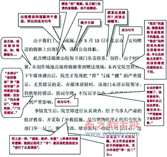 首先是语法、标点及表述问题。“终于再次道歉了。不过看了这封文字水平低劣的道歉信后,我觉得故宫可能要不停地道歉下去。”网友“一派天机”昨天下午发了一篇专门“挑刺儿”道歉信的微博,并感慨说:“初中二年级以上语文及格的学生都能写出水平更高的文字。”