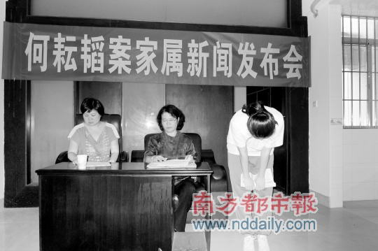 昨日下午5时许,何耘韬的家属在湛江市荣基大厦召开发布会,何耘韬的妻子冯丽在发布会上说,丈夫仍在看守所内,但至今没有认罪,坚持认为其行为或有错,错在不死守原则,但并不构成犯罪。“当初要是顶住市政府的压力不签字办证的话,说不定早就因为‘破坏招商引资,破坏廉江经济建设’获罪。总之,你这样干有罪,不这样干也有罪。”