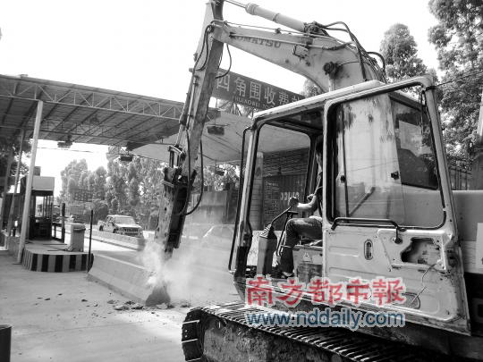 南都讯 昨日下午4时,广州花都区四角围收费站暂停了收费。工作人员将收费栏杆拆下,一辆钩机开进收费站准备将收费站拆除。与此同时,花都杨荷收费站、炭步大桥收费站、龙口收费站和横沙收费站也同时暂停收费。