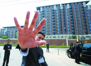 钓鱼台七号院楼盘昨日已被暂停销售。5月26日该楼盘工作人员拒绝记者拍摄。新华社发