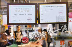 在玻璃箱旁边的栏杆上,重庆晚报记者果然看到悬挂有两张市林业局颁发的陆生野生动物或其产品经营许可证的复印件。许可证上标明:经审核,允许经营以下陆生野生动物或其产品:虎纹蛙、牛蛙、黑斑蛙。有效期至2011年12月31日。许可证副本上写明,经营单位或个人为李义,经营地点在渝中区西三街农副水产品市场。