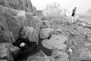距月亮湾景区数公里远的九丈崖景区,也有同样情况出现。在那里,很多红色的礁石上都沾有黑色的油污。