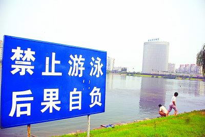 警示牌阻止不了市民下湖游泳。曹卢杰 摄