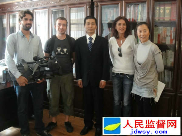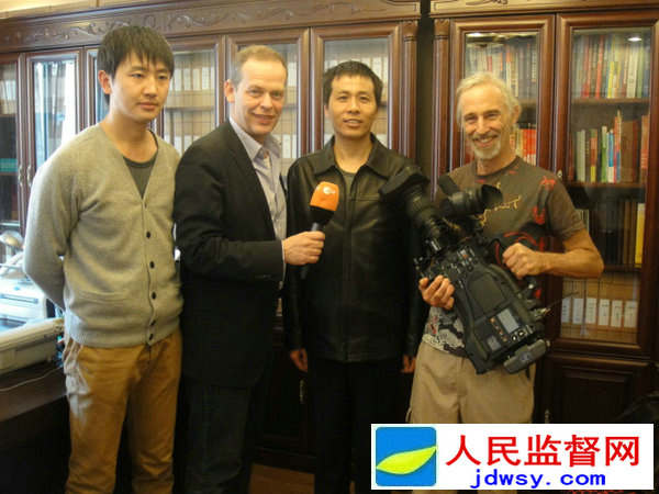 图:人民监督网朱瑞峰主编(中)接受德国电视一台北京记者处首席记者安珂丽(右二)女士专访;右一为德国电视一台北京记者处制片人陈璐女士