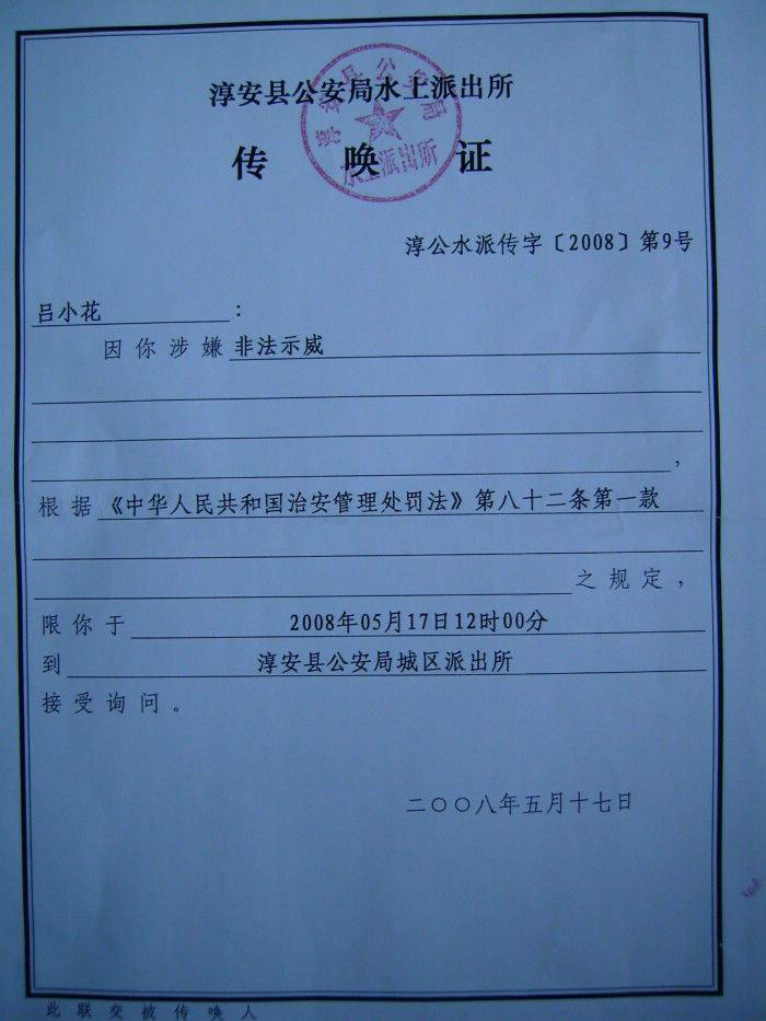 2008年5月11日、12日、13日淳安县公安局水上派出所部分警察,分别对依法建议罢免的部分民众被带往派出所。