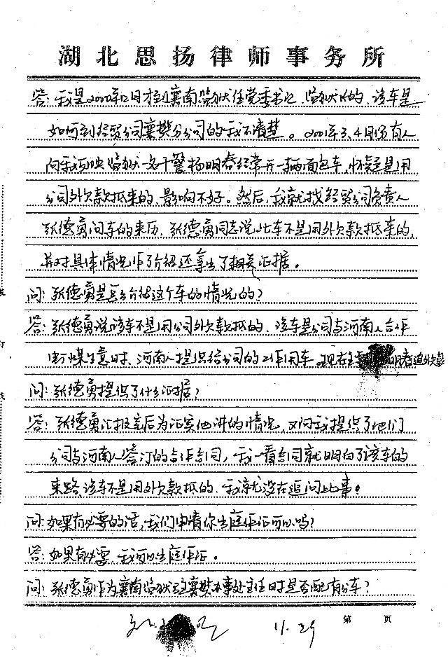 2、周家森的询问笔录(卷228页)——证明了杨明春将协议拿给公司副经理周家森过目,同时证明了襄樊分公司与袁朝伟有这样的合作项目,以及该车的来源和权属。证实了为履行合同到电厂多次去联系业务的事实。同时证明了襄樊分公司撤消杨明春调回监狱后,又回到襄樊使用该车催收外欠款的事实。