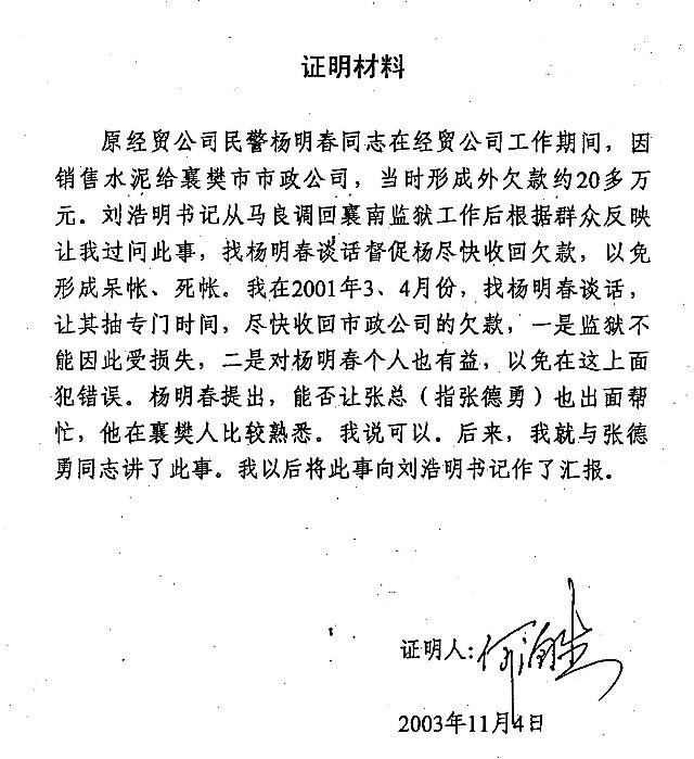 3、时任襄南监狱党委书记、监狱长刘浩明的证言——证明了张德勇向其汇报了该车的来历,权属、合作项目,同时证明了该车是杨明春在使用,也证明了监狱给张德勇配备有牌号为鄂警666的警用轿车。