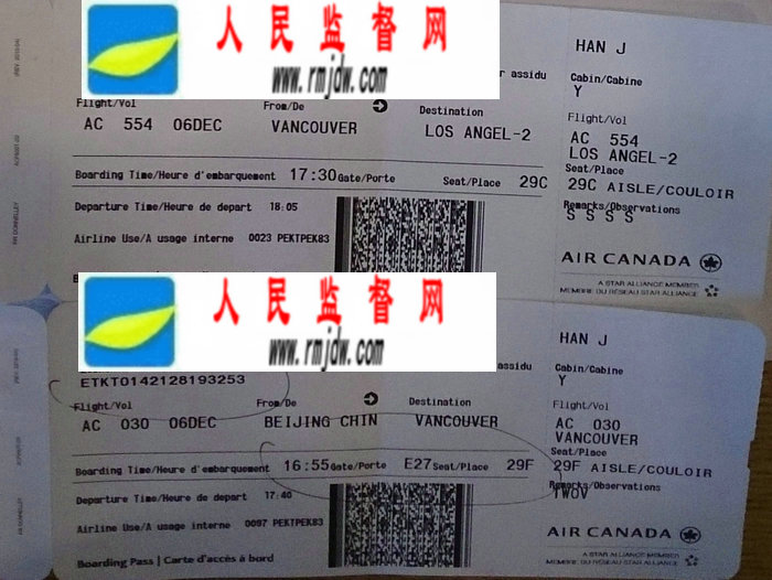 图:国家发改委高官孔泾源情妇的登机牌